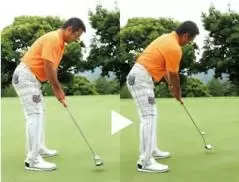 ソールして構えると、ボールの芯よりもフェースの芯のほうが低くなり、このままでは芯と芯が合わない。