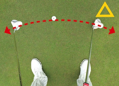通常のショットと同じように、インサイド・イン軌道でフェースを開いて閉じるのも一つの打ち方。ただし、振り幅が小さいパッティングではその加減が難しい。