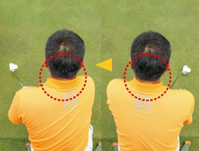 首の付け根を意識することで、頭が動かなくなり、パターのストロークの正確性と再現性が高くなる。アマチュアは無意識のうちに体が動く(揺れる)ため、ここがズレてしまう。