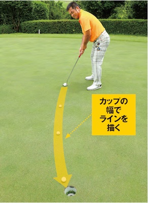 私はいずれも後者のタイプで、「カップの幅」の太い線で、全体のラインを描いています。このほうがラインをイメージしやすく、カップインの間口が広くなるからです。太い線なら、ボールをそのラインにぽんと乗せてあげるだけなので、余計なプレッシャーがかからないという利点もあります。