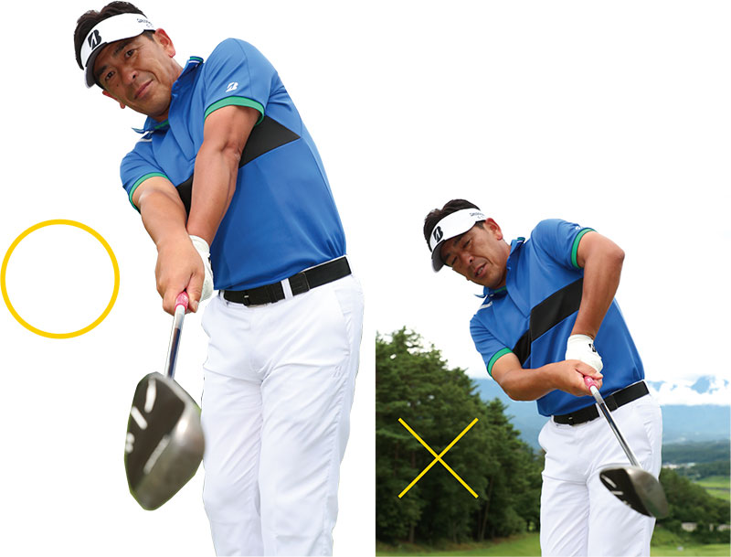 手首を意識することに加えて、両腕の上腕内側がくっついたフォローを目指すと、右手と左手が自然と入れ替わりよりスムーズにフェースが返る。
