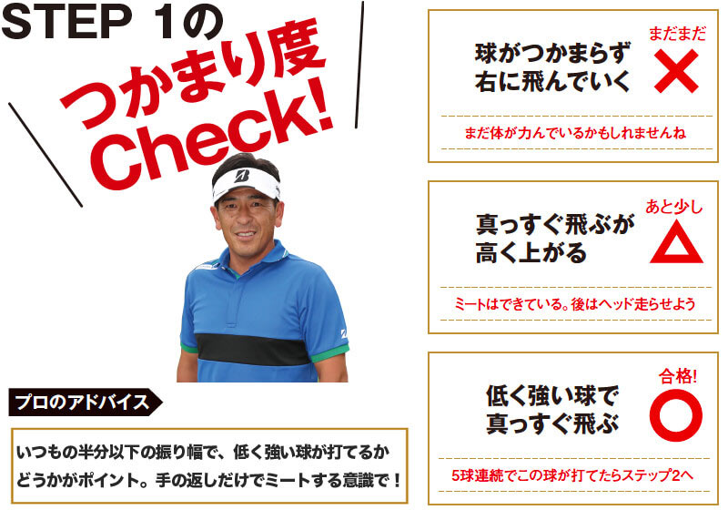 - STEP2 フェースが返りにくい長いクラブで返す動きにTRY