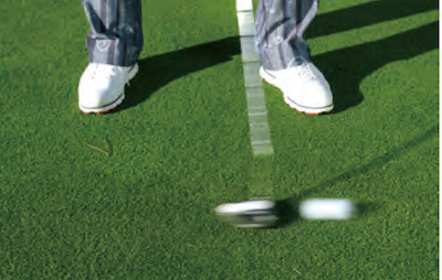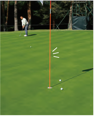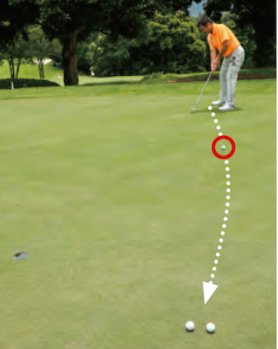 まず、目標を設定しない(カップを狙わない)で、10~15メートルの距離を適当に打ちます。ここで大事なのは、ボールが完全に止まるまで、コロがりをよく見ること。最後にスッと伸びるのか止まるのかをチェックし、そのラインを往復します。