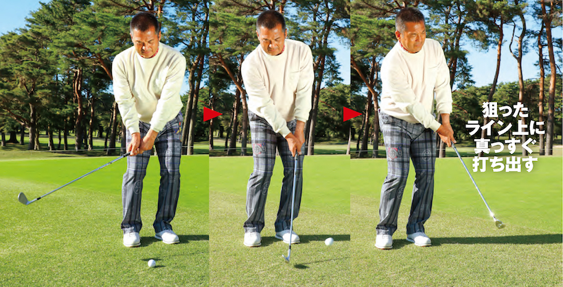 振り幅と打つ強さを掛け合わせて距離感を作り、ラインを出していくという作業は、アプローチもパッ ティングも同じ。ですから、ロングパットになると距離感が途端に合わなくなる人は、このランニングアプローチの感覚を思い出してください。いいかえると距離感が合わないのは、パッティングだけ特別なことをやろうとするからなのです。
