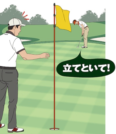 通常、同伴プレーヤーやキャディは親切に旗竿に付き添おうとするはず。意思表示を明確にしよう。