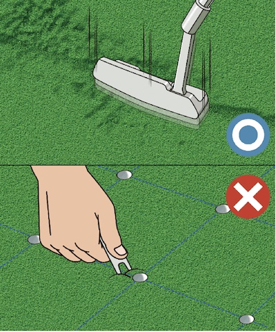 改正された新ルールではスパイクや旗竿での引っかき傷など、ほとんど修復OKになった。ただし、エアレーションの穴だけは直せないことに。
