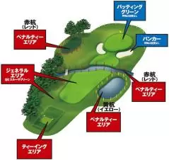 旧ウォーターハザードと、新たにブッシュなどプレーが困難な場所を赤杭、黄杭で囲んだエリア。救済処置は、黄杭は以前と同じ。赤杭はラテラル処置と呼ばれ、対岸エリアの処置がなくなった。