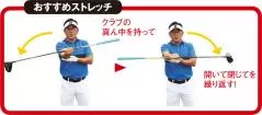 右手でドライバーの真ん中を持ち、「開いて閉じて」をくりかえすストレッチをすると、右腕がスムーズに返ります。ドライバーで打っても左方向に球が出るようになれば、完璧です!