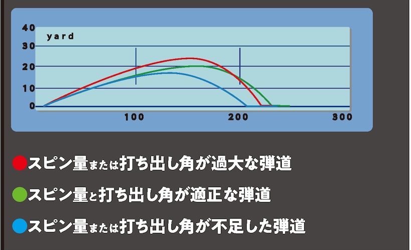 最近は「低スピン・高打ち出しだから飛ぶ」というフレーズをよく耳にしますがスピンは少なく、打ち出しは高いほどいいということではありません。打ち出しが低くスピンが多すぎるゴルファーが多いので、そんな人は、今よりも低スピン・高打ち出しが適正値だということです。