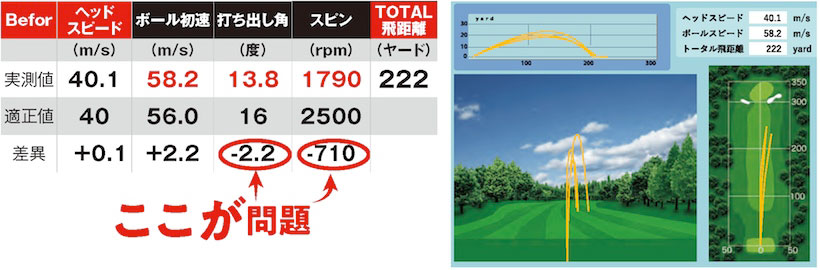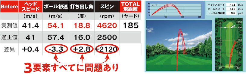 適正値に対してボール初速が低く、打ち出しとバックスピンが大きすぎる。弾道図で右に打ち出されスライスしていることからも、フェースが開き、ロフトが寝てインパクトしていることがうかがえる。