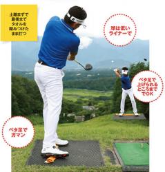 いよいよステップ4では、普段のドライバーショットの足幅にスタンス広げて球を打ってみます。ただし、足幅を広げると余計な動きが出やすく新たなミスを誘発しやすいので、ここではタオルを踏んで、ベタ足のまま打ってスイングをがっちり固めます。