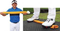 フェースタオルを折りたたみ、土踏まずで踏んで打とう。タオルを踏むことで足への意識を向けやすく、また、重心位置の変化を把握しやすくなる。アドレス時の重心位置を保ちながらバランスを保って振ることができればOK!