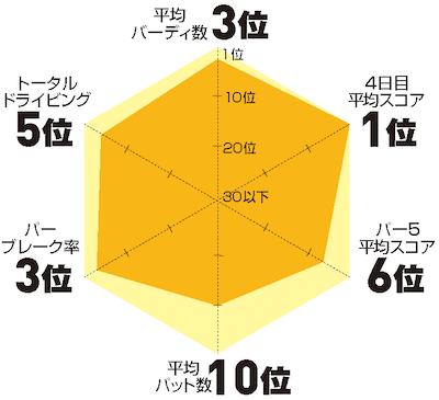 バーディ数や、パーブレーク率の順位や、平均パット数が高いことからもわかるように、どちらかと言えば狙ってバーディを取りに行くスタイルが見えてくる。そして、パー5での平均スコアも上位であることから、飛距離や方向性にも高い精度があり、全体的なスコアの底上げをしていると言えるだろう。