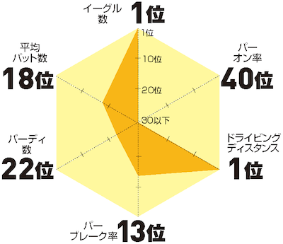 パーオン率が3位であることから、ショットの精度が高いことが窺える。バーディ数は全体の65位と低迷。しかしリカバリー率が高いことから、グリーンを外してもアプローチでの寄せワンの精度が高い。それでも勝利を積み重ねていることから、まさに「流れ」を読んで、自分の日だと思ったときの追い上げがすごいことがわかる。
