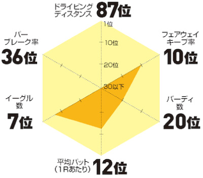 パーオン率が3位であることから、ショットの精度が高いことが窺える。バーディ数は全体の65位と低迷。しかしリカバリー率が高いことから、グリーンを外してもアプローチでの寄せワンの精度が高い。それでも勝利を積み重ねていることから、まさに「流れ」を読んで、自分の日だと思ったときの追い上げがすごいことがわかる。