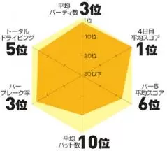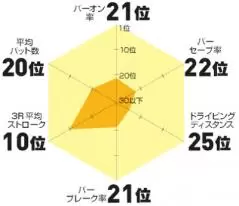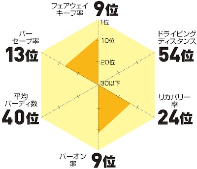 バーディ数や、パーブレーク率の順位や、平均パット数が高いことからもわかるように、どちらかと言えば狙ってバーディを取りに行くスタイルが見えてくる。そして、パー5での平均スコアも上位であることから、飛距離や方向性にも高い精度があり、全体的なスコアの底上げをしていると言えるだろう。