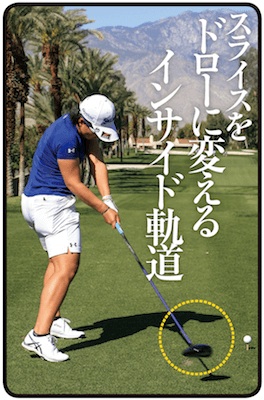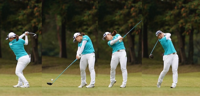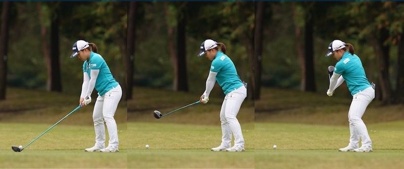 このスイングを、ヘッドスピードが50m/秒を超える選手がやると、少しのミスでも致命傷になりますが、ヘッドスピード41、42m/秒くらいの女子プロなら大きなミスにはなりません。そういう意味では、スライスに悩むアマチュアが、効率よくボールを打てるお手本スイングといっていいでしょう。