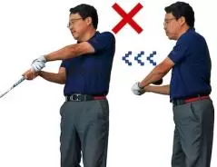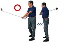正しい動きをイメージするには、水平素振りが有効。クラブを水平に持ち、ヒジを中に入れて素振りします。肩とヒジが入れ替わる動きがマスターできます。