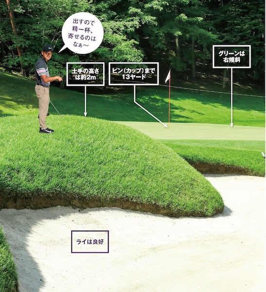 ピンまで13 ヤードとまあまあ距離があるのでしっかり打ちたいところですが、土手をクリアするにはボールを高く上げなければなりません。高さを出せば前には飛ばなくなりますが、ここは仕方ない。今回のバンカーショットでは、まず出すことを優先して距離は二の次に考えます。