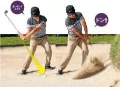 スイングは上から「ドン!」で終わり。前が土手でフォローは取れませんから、砂に打ち込むだけ。ボール1個分くらい手前にヘッドを落とす感じです。ボールを上げようとすると出ないので、最後まで左足体重をキープして打ちます。