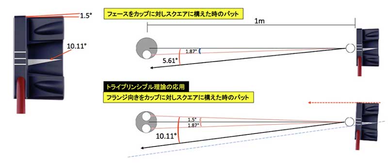 フェース面に対して1.5°裾広がりの傾斜を付けたフランジをカップに対してスクエアに構え、1.5°開いた状態にすると、0°~10.11°の範囲内でストロークすればカップインすることになり、ストロークの許容角が従来の5.61°の約2倍に拡大。ヘッド裏側のガイドラインも10.11°とし、ストロークの目安となっている。