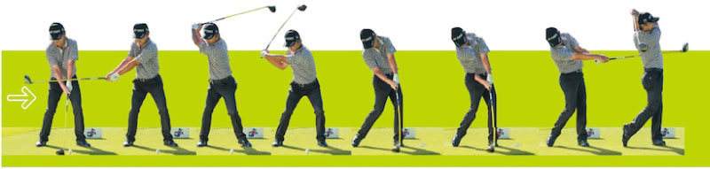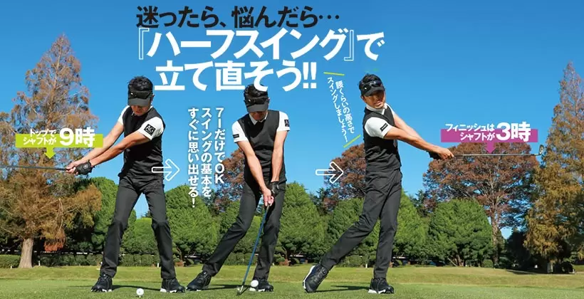 ハーフスイングとは、右腰くらいの高さまでバックスイングし、左腰くらいの高さまで振り抜くスイングのこと。時計盤でいえば9時から3時までの振り幅で、プロたちはこの扇のゾーンをインパクトゾーンと考えている。