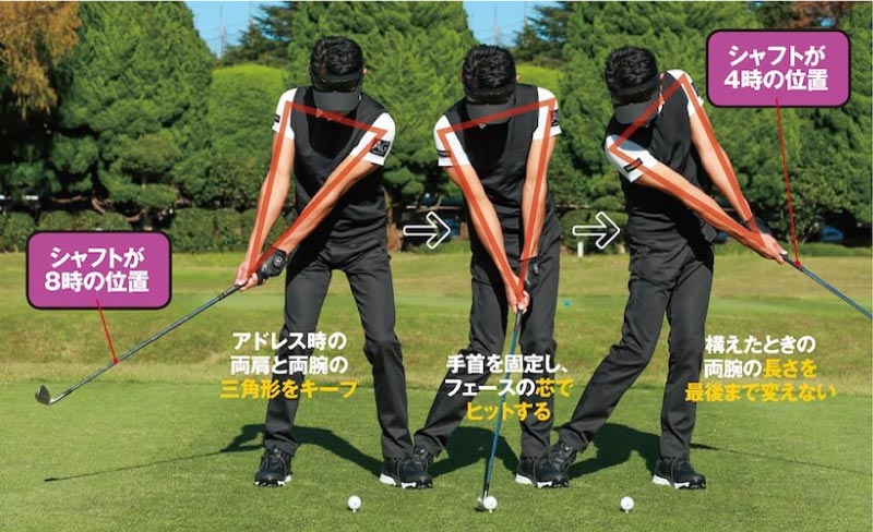 小さいスイングだからといって、腕や手でクラブを操作したり、手首の角度が変わったりしてはいけません。腕とクラブを胸の前に固定し、胸を左右に回すだけの動きでスイングすることが重要です。フォロースルーではとくに両腕が縮みやすいので、真っすぐ伸ばした状態で振り抜くことを意識しましょう。