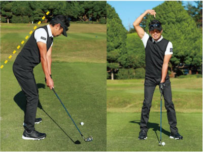 アドレスの前傾角度を変えないことが大切(写真左)。頭をスタンスの中央にキープする(写真右)。