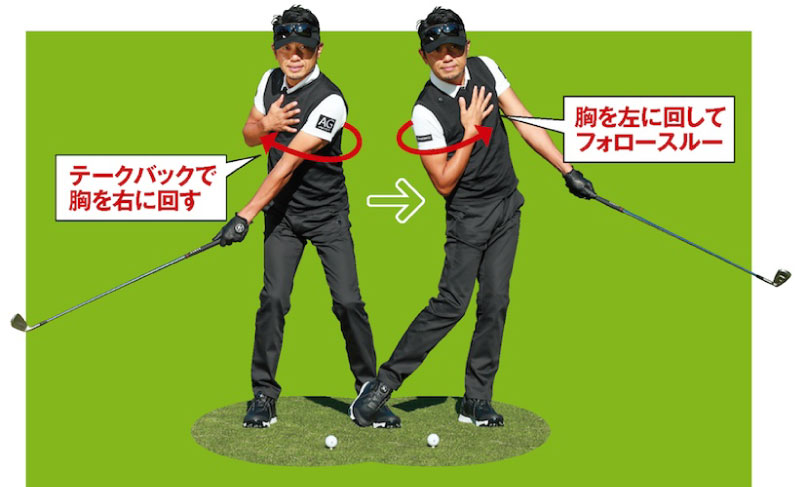腕をねじらずに左右対称に振ってフェースターンを抑える