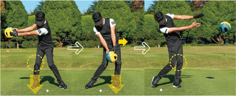 ただしハーフスイングでは、フルショットと同じくらいに体重移動を積極的に使いましょう。両手にメディシンボールなど重いものを持ち、目標方向に放り投げるような感覚です。