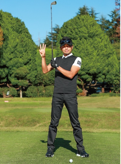 ショートスイングで腕や手に無駄な動きをさせない感覚をつかんだら、9時から3時までの振り幅のハーフスイングの練習に進みましょう。この場合もアドレスの姿勢は同じですし、スイングの感覚も変わりません。