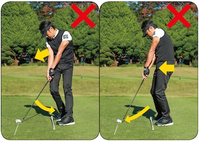 パワーのベクトルをボールに向けると腰が前に出やすい(右)。パワーを目標よりも左に向ければ上体が突っ込んでしまう(左)。