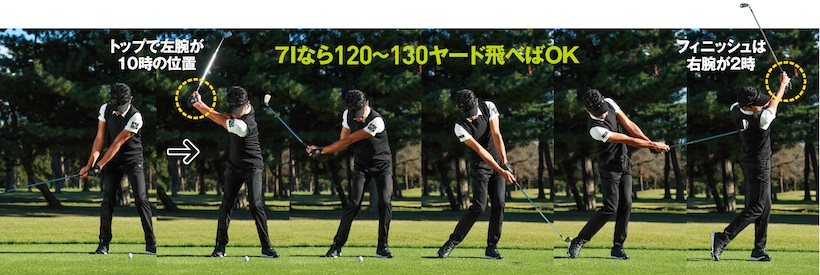 ハーフスイングの練習の成果が表われたら、今度はスリークォータースイングの練習に進みましょう。振り幅はトップで左腕が10時、フィニッシュで右腕が2時くらいが目安です。