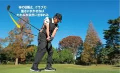クラブを肩に当てて体重を右足に乗せながら胸を右に回そう。ダウンスイング以降は体重を左足に移動して胸を左に回す。これが回転動作の基本となる。