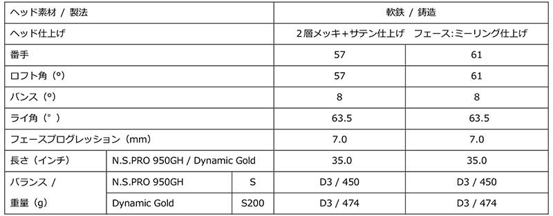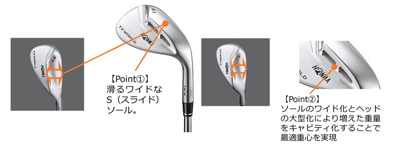 滑るワイドソールでありながら、高重心設計を実現した「Sソール」採用の 57°、61°をラインアップ。既に発売済みとなっている「Iソール」「Cソール」とともに用途を考慮した3種のソール形状でのラインアップとなり、“ハイパフォーマンス”なツアーウェッジとなっている。