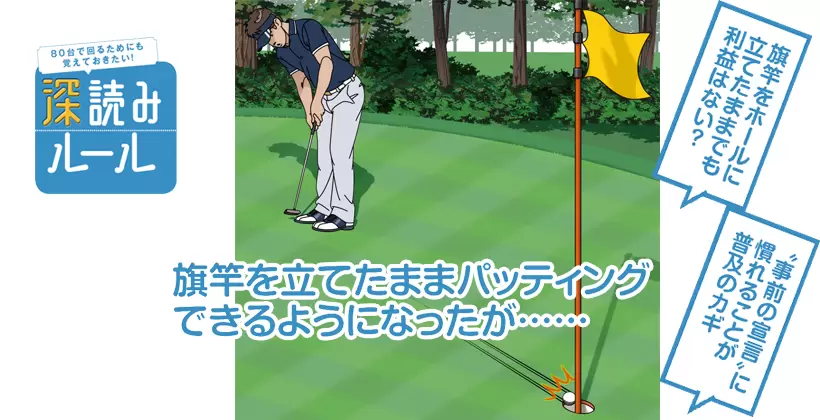プレーヤーは旗竿を立てたままにするために、パットの前に「立てといて」「抜いて」「付き添って(入る前に抜いて)」のいずれかを“宣言”する必要がある。これをしないと、気を利かせたつもりで他のプレーヤーやキャディが打球後に抜いてしまい、思わぬペナルティが発生する危険性もあるのだ。