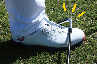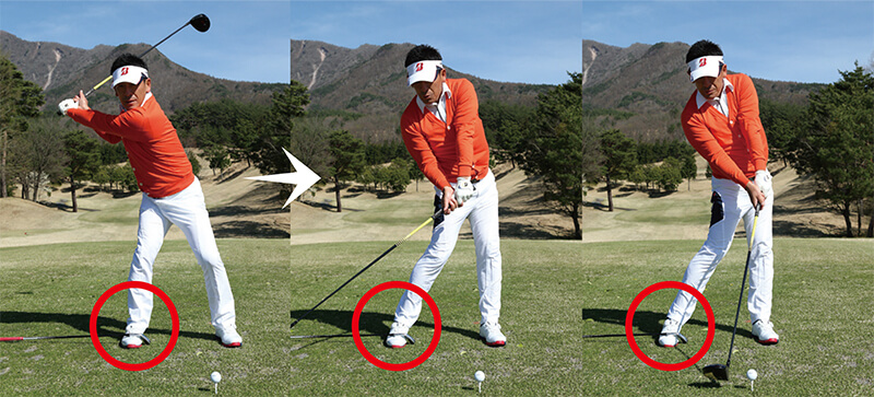 右足は踏ん張って地面を押しつけ、下半身をグッと安定させてインパクトを迎えることが大事。この動きを身につけるには、アイアンのクラブヘッドを右足に置いてスイングするのが効果的です。ベタ足のままガマンしてヘッドを動かさないように意識しながら、最初は小さなスイングから始め、慣れてきたら実際に球を打ってみましょう。