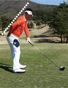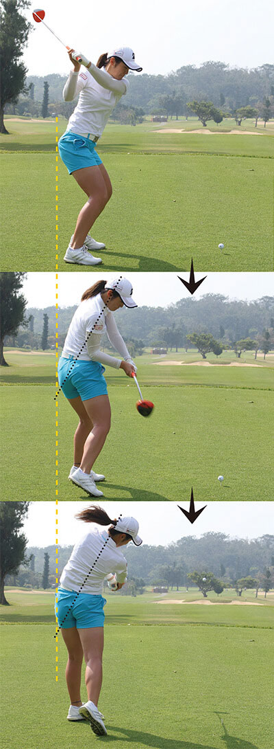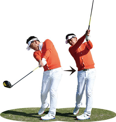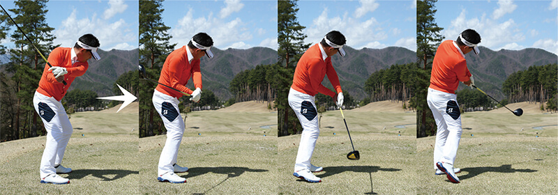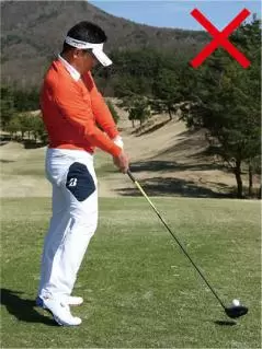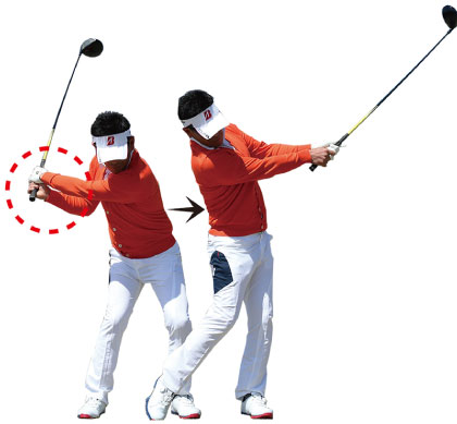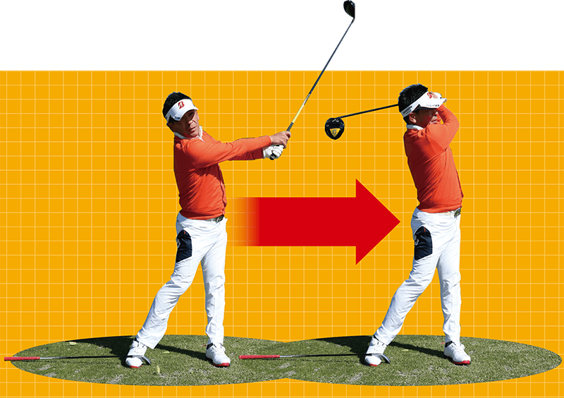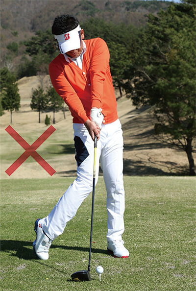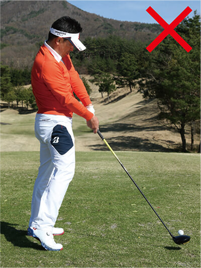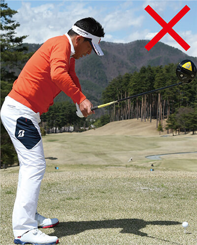 飛ばそうとすると無意識にスイングが大きくなり、つられてトップで体が伸び上がってしまうケースが多いもの。トップで体が伸び上がるとインパクトでは上体が突っ込むため、極端に上から打ち込む形になってしまって効率よく飛ばすことができません。