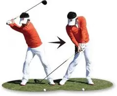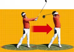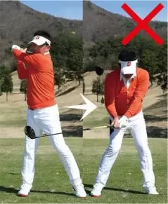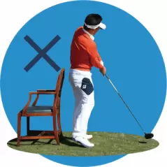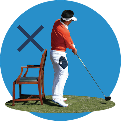 そんな人には、椅子にお尻をつけたままスイングする「椅子ドリル」がおすすめ。椅子の背もたれ部分にお尻を当てたら、トップでは右のお尻を、フォローでは左のお尻を当てる意識で、常にどちらかのお尻を椅子につけたまま振ってみましょう。