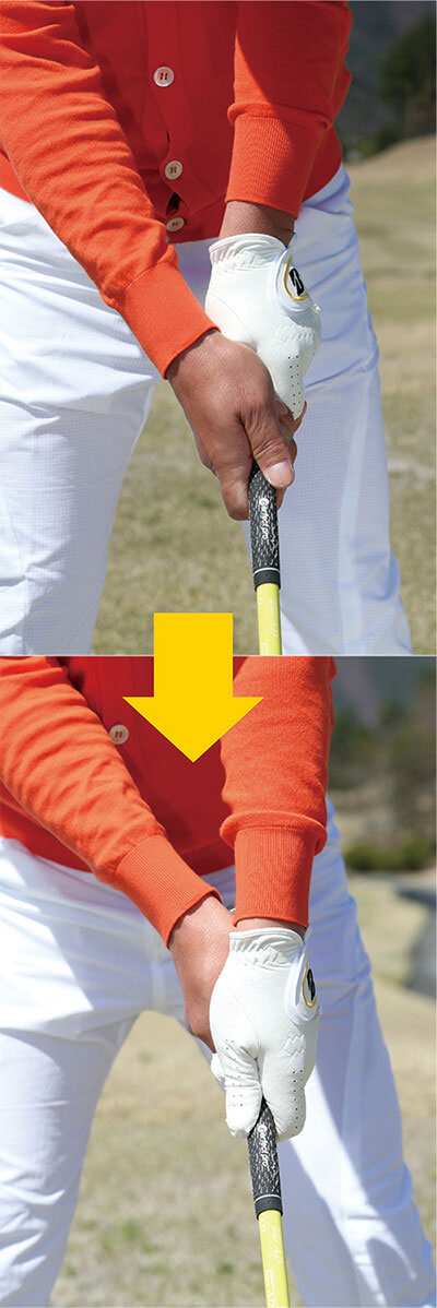 クロスハンドグリップで振ってみると、自動的に右手が強くなるのを抑えられるので、脱力したまま振る感覚をすぐさま実感できるはずです。ドリルを重ねることでこの動きを体に叩き込めば、右ワキを締めた状態でクラブをインサイドから下ろせるようになり、結果、球がしっかりつかまって飛距離アップが期待できるというわけです。