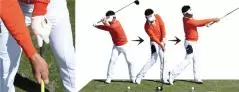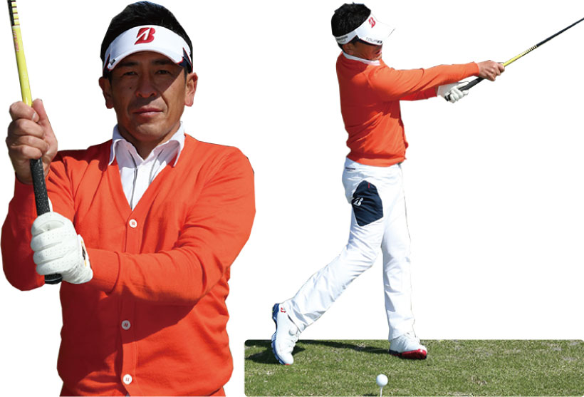 両手を離すと右手、左手、それぞれの動きを認識しやすく、いつもどおりスイングするだけで、右手が左手を追い越して左右の手が入れ替わる「正しいリストターン」が体現できます。同時に、しっかりと手首が返れば左ワキは自然と締まることもわかるはず! この感覚と動きを体にしっかり叩き込みましょう。