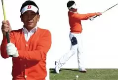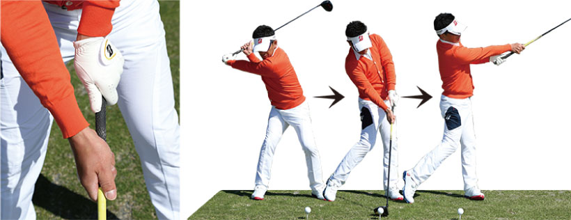 まず、右手と左手を入れ替えたら、通常のグリップと同じように、上にくる左手の小指を右手にかけてしっかり握ります。あとはいつもと同じように振るだけ! 構えた時点で右ワキの締まりを感じられるので、この状態をキープして振るのがポイントです。最初は素振りで動きを確認し、慣れてきたらハーフスイングでリズムよく球を打ってみましょう。