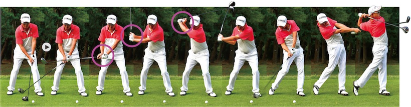 ですが、捻転は十分。そして、下半身リードからの力強い切り返しからフィニッシュまでは、ボールがつかまらないと嘆くアマチュアにはとても参考になる部分です。