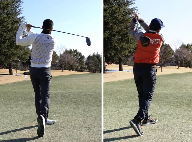 左:佐藤順(ハンデ+1のトップアマ。ヘッドスピード47。ほぼストレートで軽く右に曲がるフェードヒッター。ドライバー飛距離は270ヤード前後)