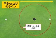 カップまでのラインが平らか、やや上りの場合は、カップを中心に1メートルくらいの円を描きます。これが基本です。