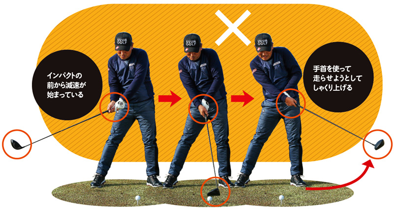 ヘッドが走らない2大原因のひとつは、インパクトで手首が折れる「フリップ」というスイングエラー(悪い動作)です。