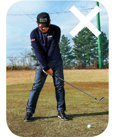 インパクトでヒザの高さをキープしようとすると、ヒザは曲がったままになりがち。そして、ヒザが曲がったままだと、腰が浮いて、フェースが開いてインパクトしやすくなる。ヒザが伸びないと、当たりも不安定になるのだ。