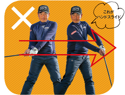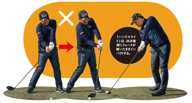 順を追って説明すると、手を使ってヘッドをボールに当てようとすると、手首の柔軟性が失われます。すると、肩・腰を回すことで、ボールに届かせようとします。いわゆる、上半身と下半身の捻転差のない「ドアスイング」になります。そして、ボールに対してフェースをスクエアに当てようとすると、手元をスライドさせる動きが発生します。これが「ハンドスライド」の仕組みです。