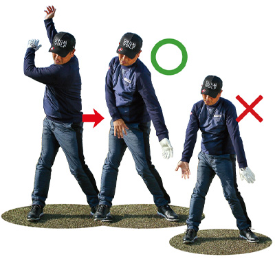 中途半端にフォローを出すと、ボールをつかまえられない。左足に体重を乗せ切るようにしてフォローを出す。