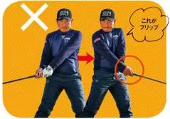 インパクトで左手首が甲側に折れることを「フリップ」という